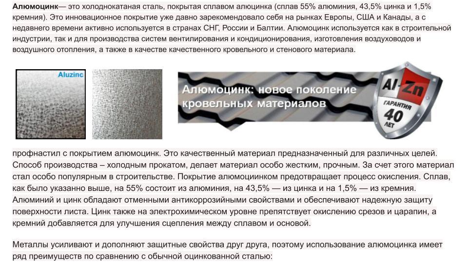 Температурна стійкість : (алюмоцинк витримує температури до 315 ° С). Алюмоцинкованные листи можуть відбивати більшу частину світла і тепла.